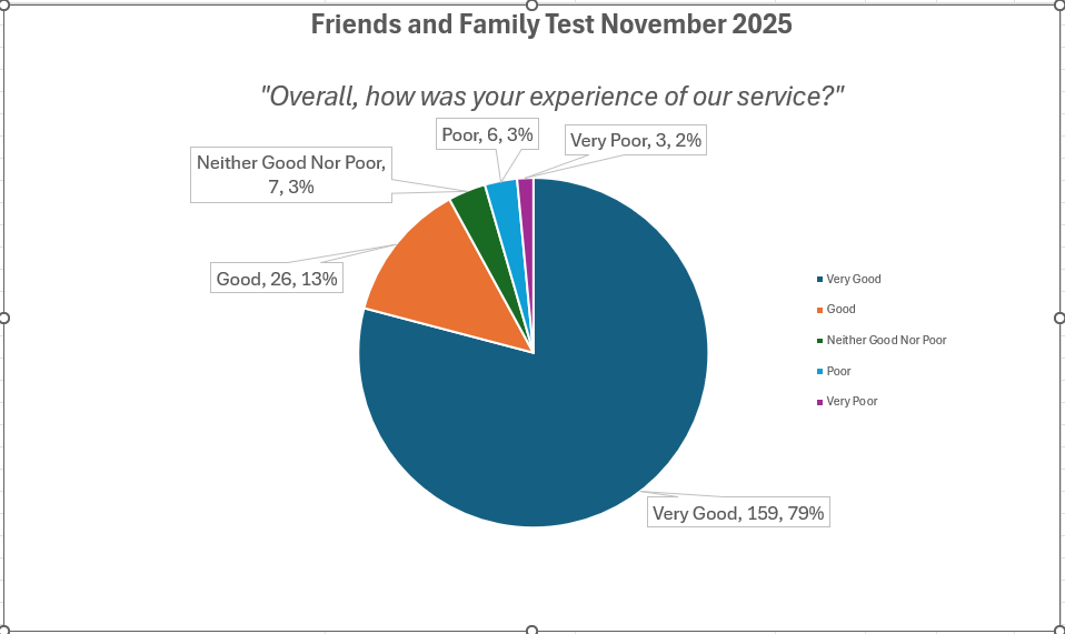 Each month, we invite our patients to complete the NHS Friends & Family Test to help us understand their experience of the care we provide. Your feedback plays an important role in helping us improve our services and continue delivering high-quality care.